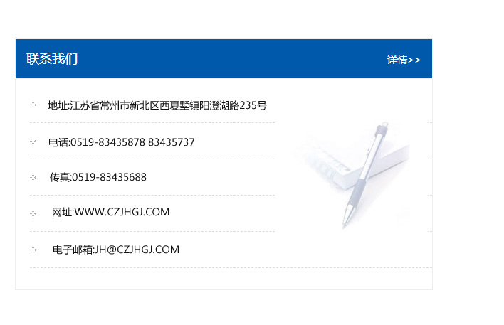 傳真:0519-83435688    郵編:213135    網址:WWW.czjhgj_com.hongdawd.com    電子郵箱:JH@czjhgj_com.hongdawd.com
